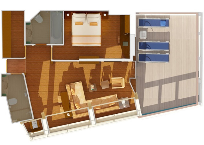 | CS - Captain's Suite 51 m² + 24 m² balkón. 9. paluba vpredu. Výhody Suite. | 7 282 € 3 641 € za osobu | ||
