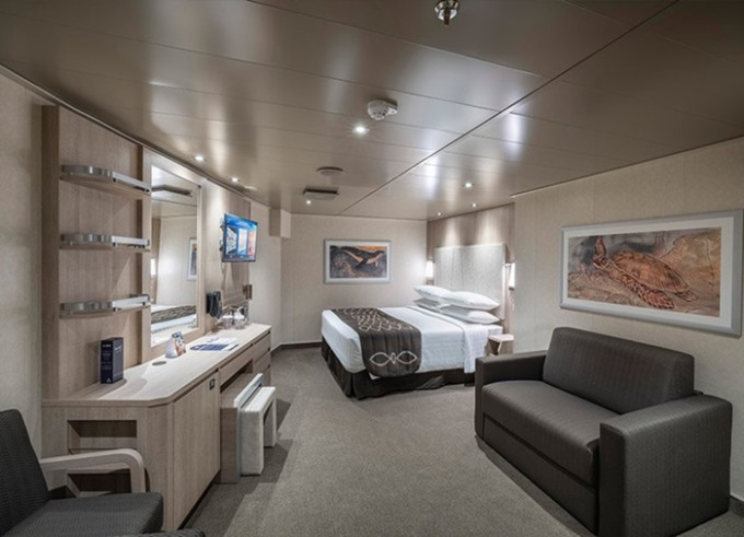 Vonkajšia kajuta s neotvárateľným oknom: 17 m², kajuta s manželskou posteľou (na požiadanie 2 oddelené postele) a 1-2 vyklápacie horné lôžka resp. rozťahovacia pohovka. Klimatizácia, kúpeľňa so sprchou a WC, toaletný stolík, skriňa, interaktívna TV, trezor, telefón, sušič vlasov, virtuálna asistentka ZOE, neotvárateľné okno. Kajuty v kategórii Bella a niektoré Junior a Deluxe majú obmedzený výhľad.
