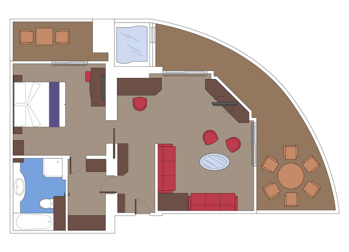 | YC3 - Yacht Club Royal Suite s vírivkou 58 m² + rohový balkón s vírivkou 70 m². Oddelená obývacia časť a spálňa, šatník, kúpeľňa s vaňou a sprchou. 15. paluba. Cenový model MSC Yacht Club. Basic fare | 6 942 € 6 942 € za osobu | ||