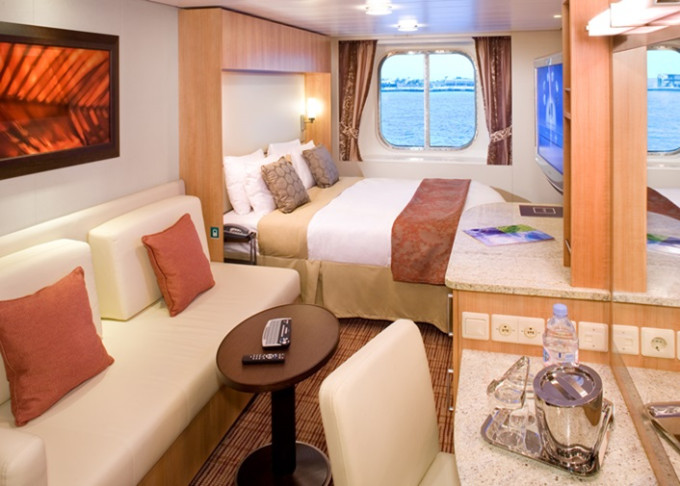• Kajuty sú umiestnené v blízkosti lodného Spa. K ich vybaveniu patrí posilnený systém vzdušnej filtrácie, posteľ Queen-Size (v kategóriách Edge King-Size), veľké zasúvacie sklenené dvere, exkluzívne posteľné prádlo eXhale®, veľkorysé skladovacie priestory.