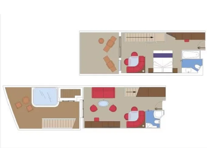 | YCD - Yacht Club Duplex Suite -46 m² + balkón s vírivkou 28-31 m². 2 podlažia, 2 kúpeľne (1 s vaňou) Max 4 osoby. 16. paluba. Cenový model MSC Yacht Club. Best price | 6 890 € 6 890 € za osobu |