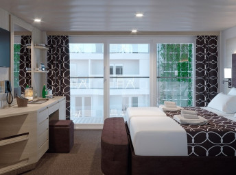 Kajuty s balkónom a vonkajšie kajuty s výhľadom na promenádu Europa.