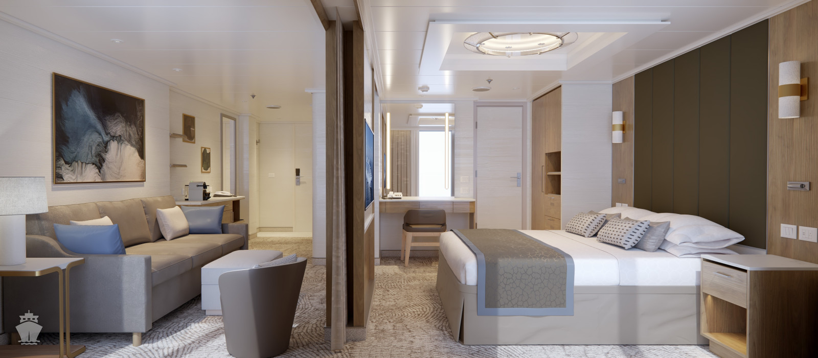 S2 - Signature Owner Suite 53 m² + 7 m² balkón. 10. paluba stred,16. vpredu. Max 4 osoby. Výhody Signature Suite. 8 416 € 4 208 € za osobu
